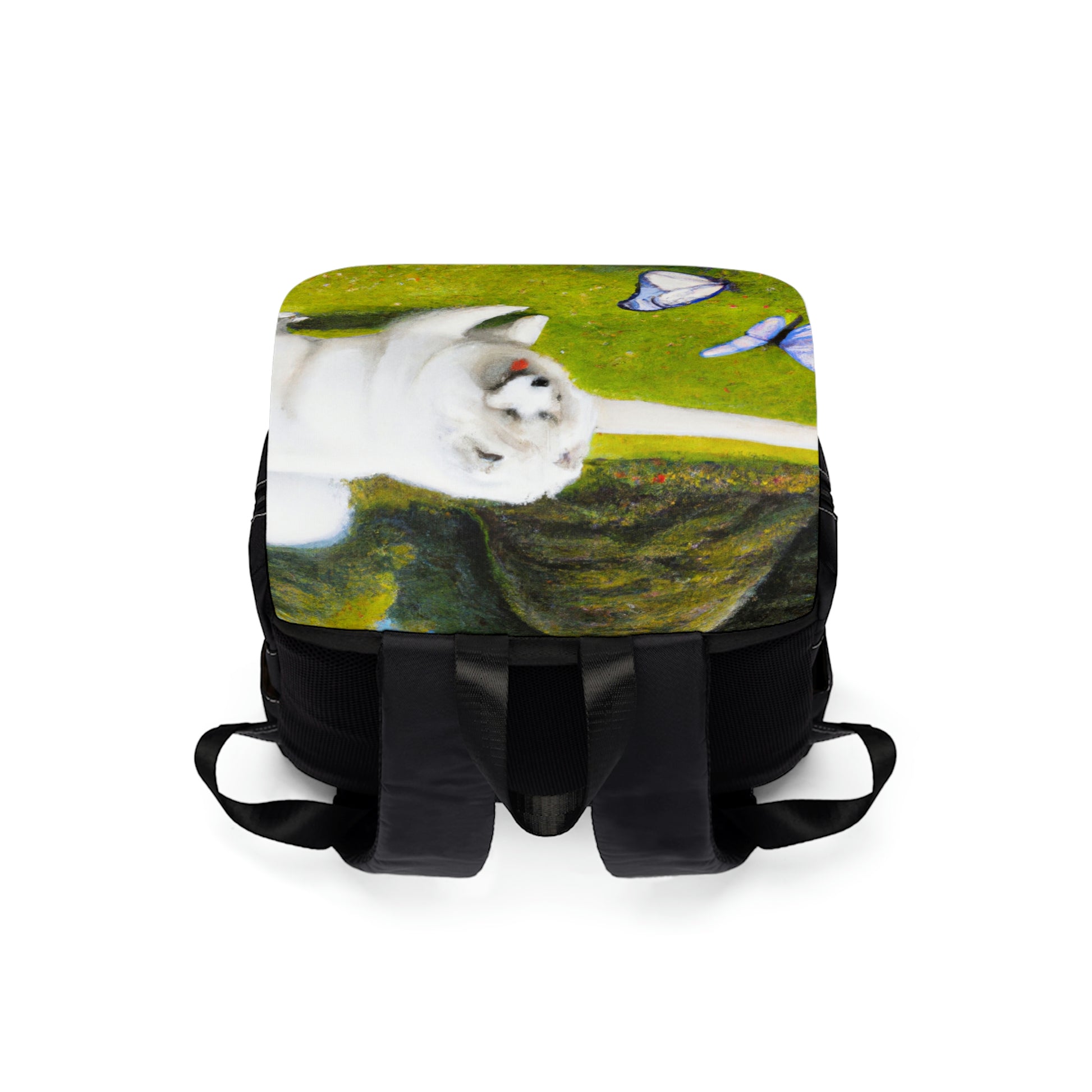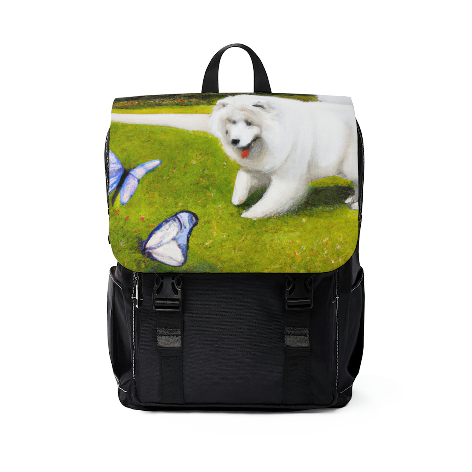 Casual Samoyed in the park small backpack in a classic shape with a front flap design. It is made of durable Oxford canvas. It has two slip interior pockets and one laptop sleeve in the main compartment, a front zipper pocket, and two side pockets. This is a good size child backpack, or a great purse backpack for adults. Note: the size dimensions.