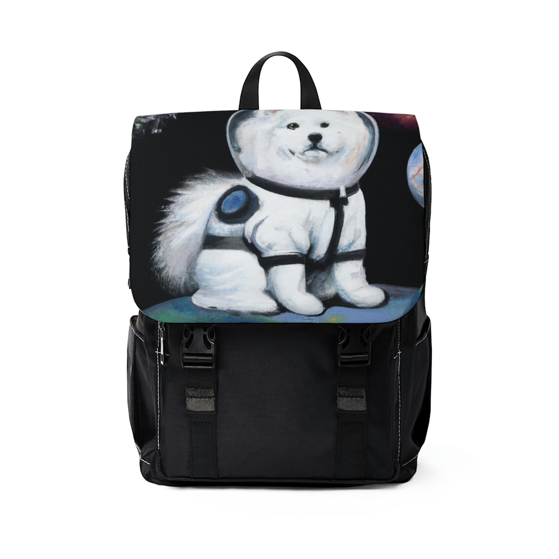 A fun and unique bag that can display your love of space and Samoyeds.
